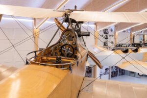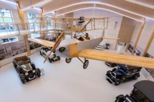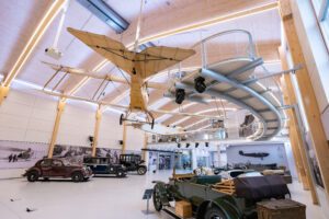 Die an der Decke schwebenden historischen Flugzeuge Hansa-Brandenburg C1 und Klemm L20 sind die Glanzstücke der neuen Flug- und Veranstaltungshalle, welche im Jänner 2023 eröffnet wurde.