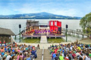 Die jährlich wechselnde Kulisse verschmilzt mit dem Blau des Sees und der sanft hügeligen Wald- und Wiesenlandschaft. Dieses traumhafte Ambiente genießen jährlich rund 9000 Besucher.